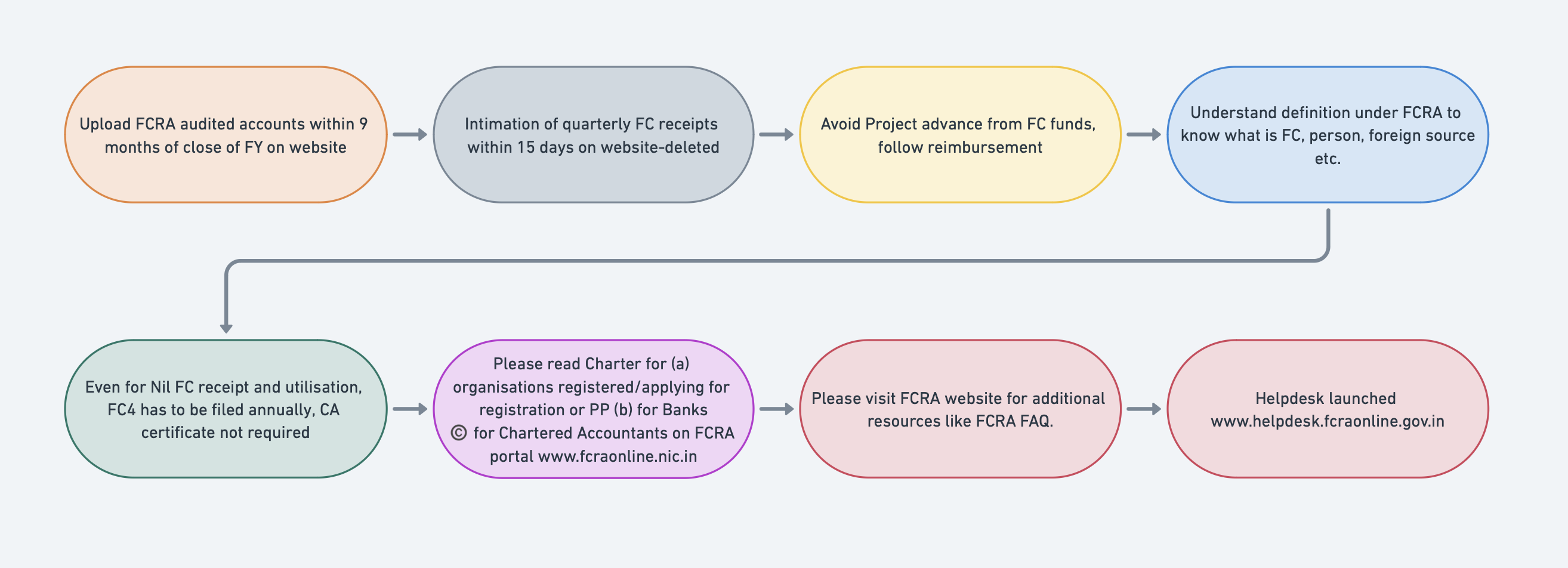 (Illustrated: Upload FCRA audited accounts within 9 months of close of FY on website ➡️ Intimation of quarterly FC receipts within 15 days on website-deleted ➡️ Avoid Project advance from FC funds, follow reimbursement ➡️ Understand definition under FCRA to know what is FC, person, foreign source etc. ➡️ Even for Nil FC receipt and utilisation, FC4 has to be filed annually, CA certificate not required ➡️ Please read Charter for (a) organisations registered/applying for registration or PP (b) for Banks© for Chartered Accountants on FCRA portal www.fcraonline.nic.in ➡️ Please visit FCRA website for additional resources like FCRA FAQ. ➡️ Helpdesk launched www.helpdesk.fcraonline.gov.in)